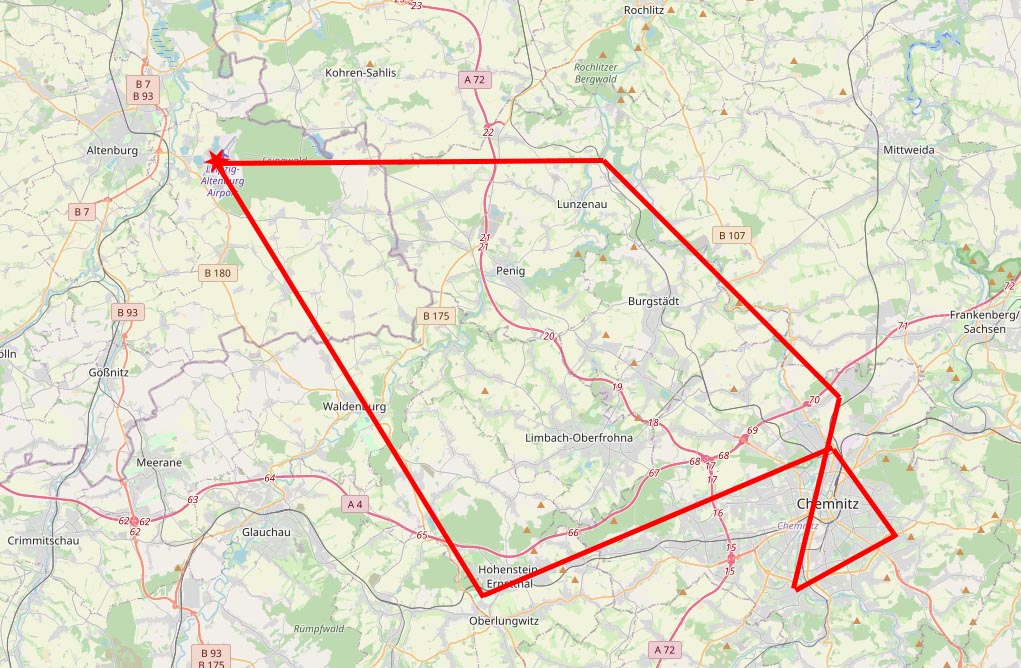 Von Flugplatz Altenburg-Nobitz aus fliegt man in südöstliche Richtung über Waldenburg hinweg zur Rennstrecke "Sachsenring" bei Hohenstein-Ernstthal. Von hier ab geht man auf einen östlichen Kurs und sieht schon den markanten bunten Schornstein von Chemnitz. Diesen kann man ansteuern, bis man das nordwestliche Stadtgebiet von Chemnitz mit Stausee und Tierpark erreicht. In einem weiten Bogen kann man nun einen Kreis über der Stadt ziehen und markante Bauten, wie das Hotel Kongress, das himmelblaue Stadion, die VW-Werke am Chemnitz-Ufer oder die Karees des Stadtteils Kaßberg aus der Luft erkunden. Vorbei am bunten Schornstein geht es nun in nördliche Richtung dem Fluss Chemnitz folgend bis in die Nähe seiner Mündung. Hier lohnen sich Blicke auf die Rochsburg im Tal der Zwickauer Mulde oder das dieses Tal überspannende Göhrener Viadukt. Mit fast genau angelegtem Westkurs fliegt man nun zurück zum Flugplatz Altenburg-Nobitz.